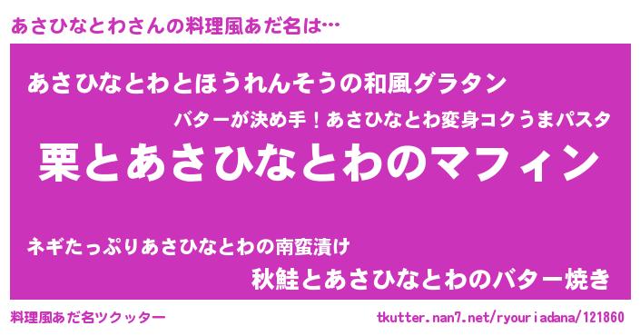 | ヘコむあだ名 | 『あさひなとわ(笑)』『あさっふぃ~』 |