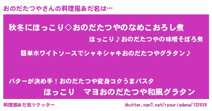 | 男性向けラノベタイトル風あだ名 | 『おのだたつやの嫁は女の子じゃないと思った?』 |