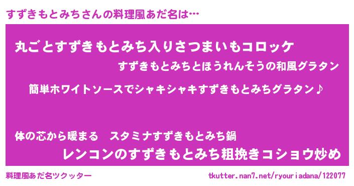 | 男性向けラノベタイトル風あだ名 | 『すずきもとみちの嫁は女の子じゃないと思った?』 |