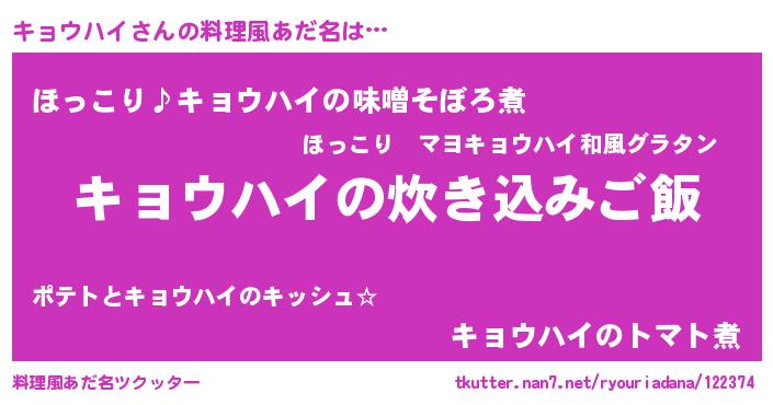| 男性向けラノベタイトル風あだ名 | 『うちのキョウハイが世界を掌握している!』 |