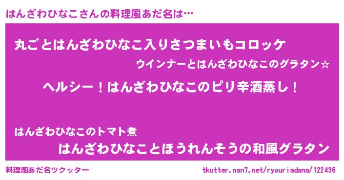 | 男性向けラノベタイトル風あだ名 | 『Re:はんざわひなこから始める異世界生活』 |