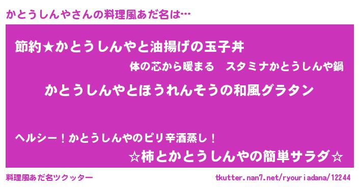 | 女子向けラノベタイトル風あだ名 | 『かとうしんやの玉の輿計画!』 |