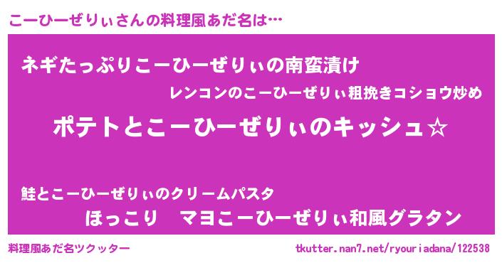 | 男性向けラノベタイトル風あだ名 | 『こーひーぜりぃの嫁は女の子じゃないと思った?』 |