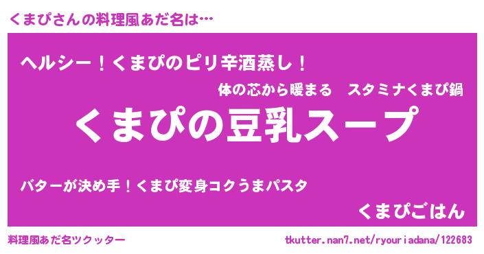 | 女子向けラノベタイトル風あだ名 | 『くまぴは平凡を望む』『くまぴ恋絵巻』 |