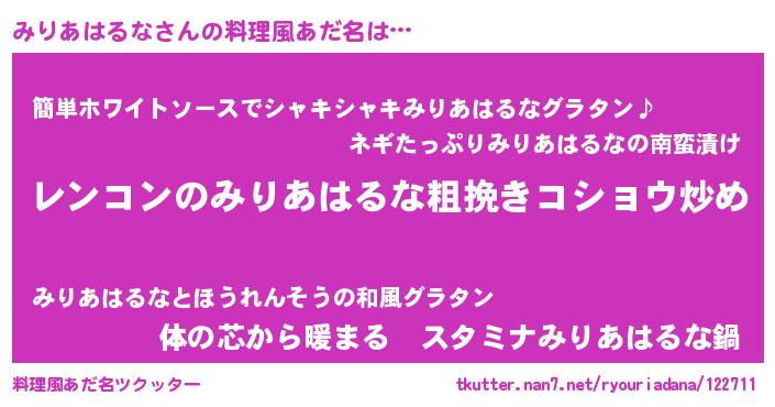 | 女子向けラノベタイトル風あだ名 | 『みりあはるななんてお断りですっ。』 |