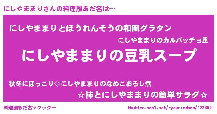 | ポケモン風あだ名 | 『ヒニシヤママリ』『ニシキング』 |