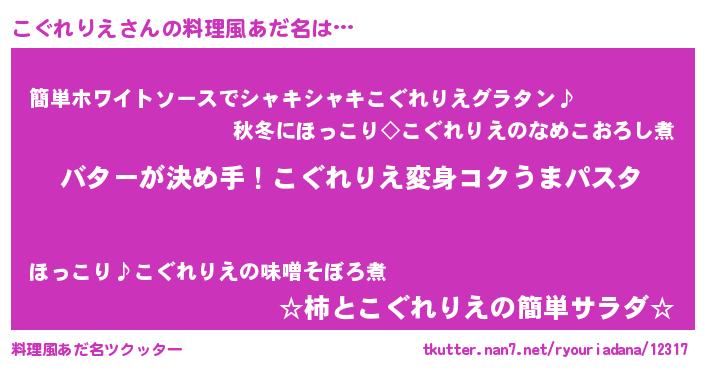 | ヒーロー風カッコイイあだ名 | 『慈愛の使者こぐれりえ』『炎刃騎士コグ』 |