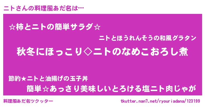 | 男性向けラノベタイトル風あだ名 | 『ニトに滅ぼされるだけの簡単なお仕事です』 |