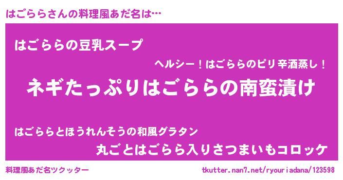 | 男性向けラノベタイトル風あだ名 | 『ハゴララアートオンライン』 |