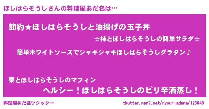 | 男性向けラノベタイトル風あだ名 | 『ほしはらそうしの嫁は女の子じゃないと思った?』 |