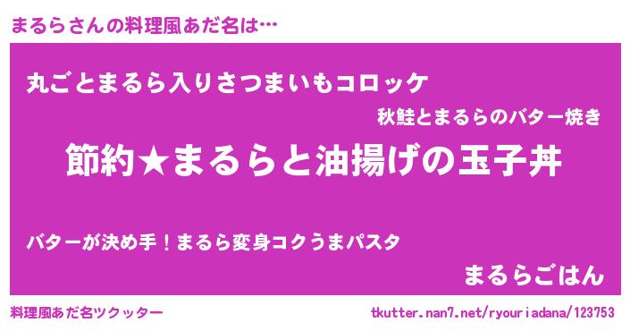 | 意味不明あだ名 | 『ペロリンまるら』『もやし科まるら属』 |