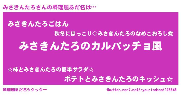 | 男性向けラノベタイトル風あだ名 | 『魔弾の王とみさきんたろ』 |
