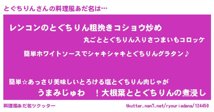 | 男性向けラノベタイトル風あだ名 | 『とぐちりんの嫁は女の子じゃないと思った?』 |