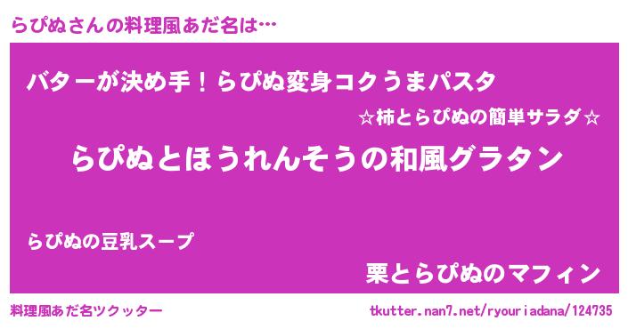 | 女子向けラノベタイトル風あだ名 | 『らぴぬの玉の輿計画!』『らぴぬ恋絵巻』 |