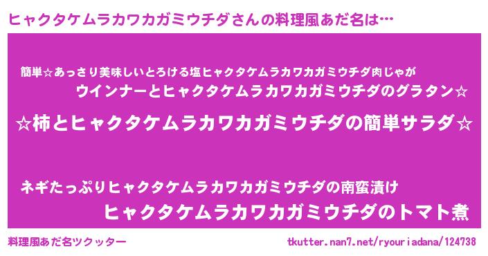 | 男性向けラノベタイトル風あだ名 | 『緋弾のヒャクタケムラカワカガミウチダ』 |