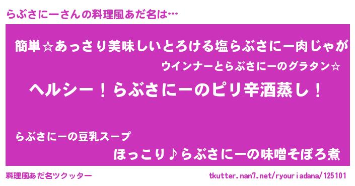 | 男性向けラノベタイトル風あだ名 | 『Re:らぶさにーから始める異世界生活』 |