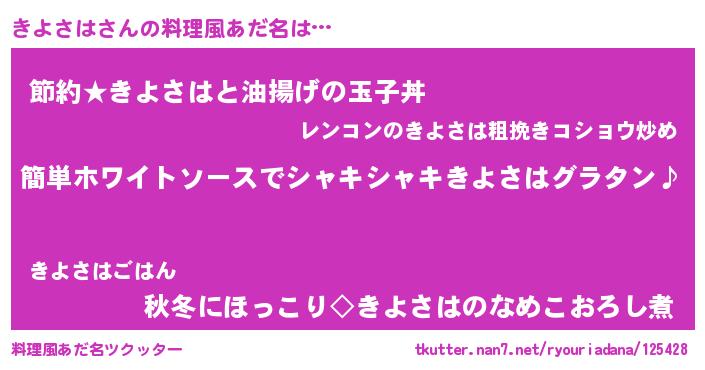 | 男性向けラノベタイトル風あだ名 | 『きよさはの嫁は女の子じゃないと思った?』 |