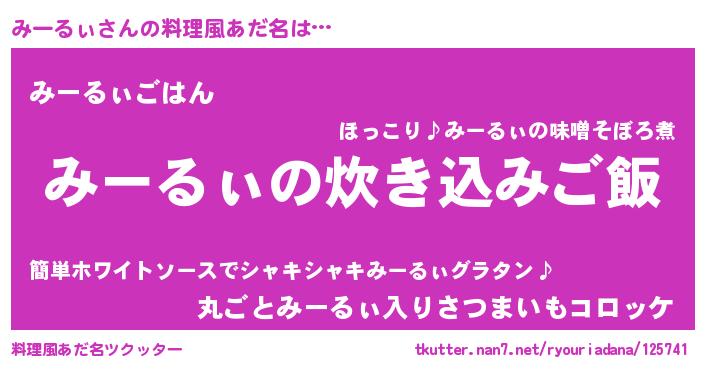 | 意味不明あだ名 | 『なめこ科みーるぃ属』『自称みーるぃ』 |