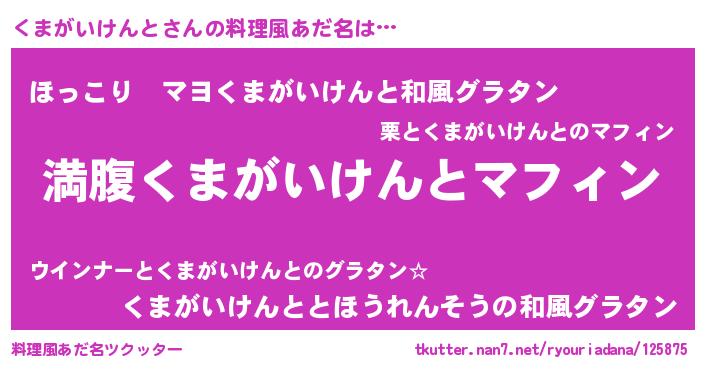 | 女子向けラノベタイトル風あだ名 | 『異世界で失敗しない100のくまがいけんと』 |