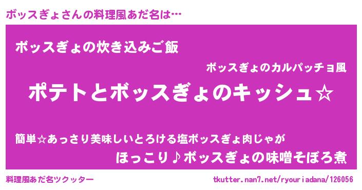 | 男性向けラノベタイトル風あだ名 | 『ダンジョンにボッスぎょを求めるのは間違っているだろうか』 |