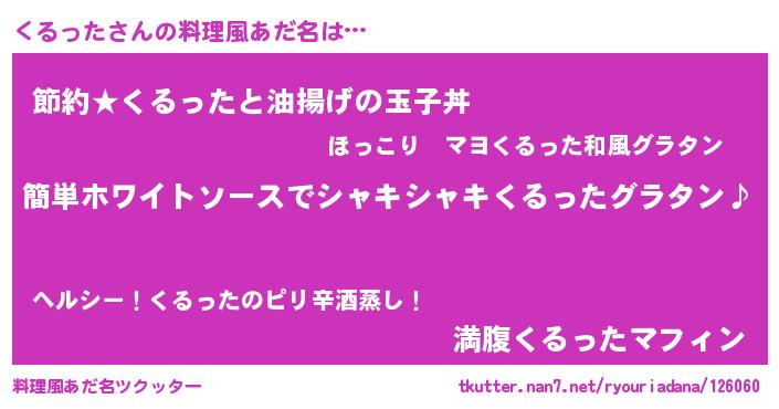 | 男性向けラノベタイトル風あだ名 | 『くるったの嫁は女の子じゃないと思った?』 |