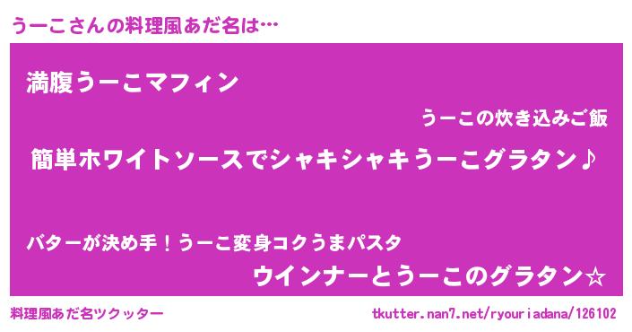 | 男性向けラノベタイトル風あだ名 | 『うーこの嫁は女の子じゃないと思った?』 |