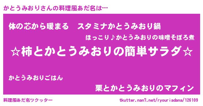| 恥ずかしいあだ名 | 『かとっちょ』『プリティーかとうみおり』 |