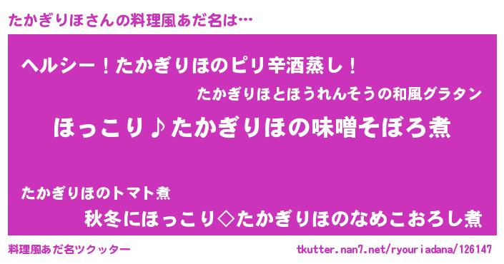 | ヘコむあだ名 | 『たかもー』『なまこ酢』『たかっ子』 |