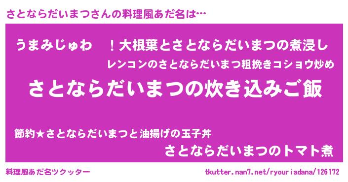 | 男性向けラノベタイトル風あだ名 | 『うちのさとならだいまつが世界を掌握している!』 |