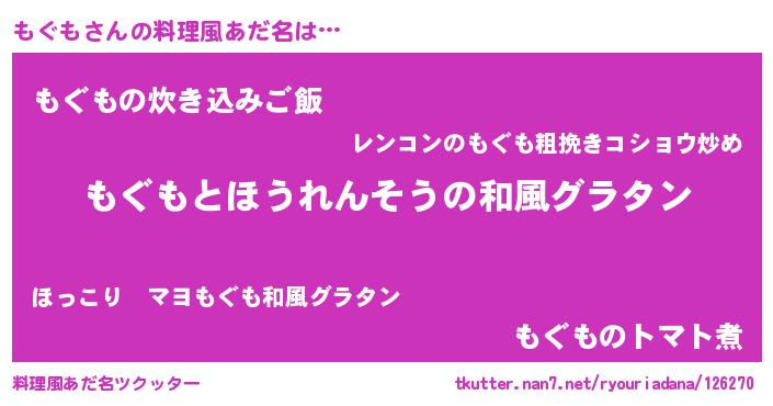 | ヘコむあだ名 | 『なまこ酢』『もぐも(爆)』『もぐを』 |