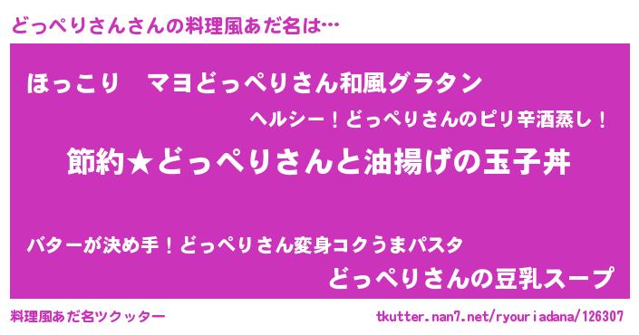 | 男性向けラノベタイトル風あだ名 | 『どっぺりさんの憂鬱』 |
