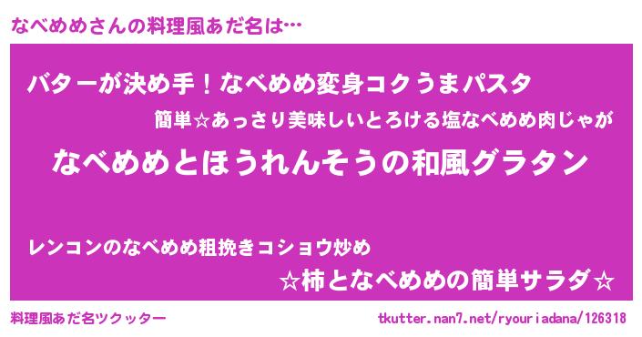 | ヒーロー風カッコイイあだ名 | 『慈愛の使者なべめめ』『ネオナベメメ』 |