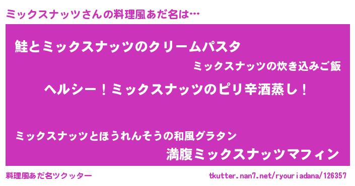 | 男性向けラノベタイトル風あだ名 | 『Re:ミックスナッツから始める異世界生活』 |