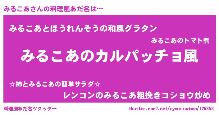 | 男性向けラノベタイトル風あだ名 | 『魔弾の王とみるこあ』『緋弾のミルコア』 |