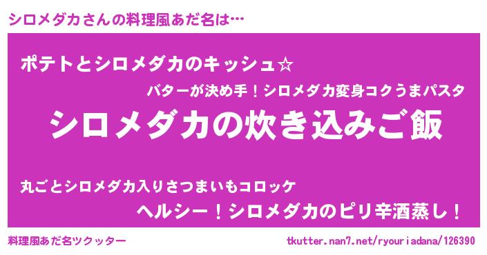 | 胡散臭い通販商品みたいなあだ名 | 『伝統あるサプリメント…その名も「シロメダカ」』 |