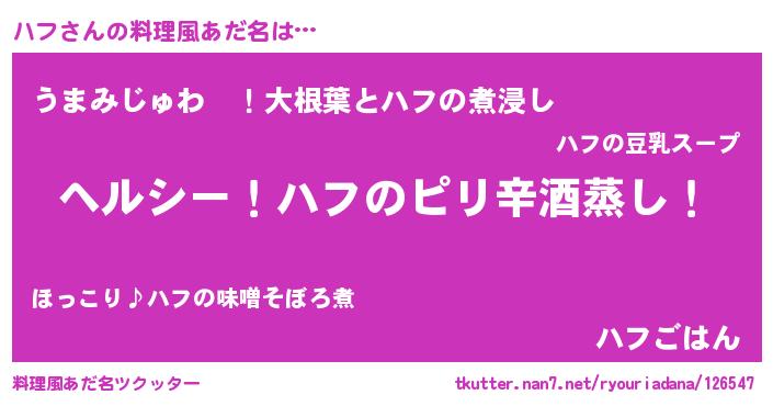 | 男性向けラノベタイトル風あだ名 | 『Re:ハフから始める異世界生活』 |