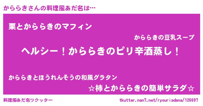 | 意味不明あだ名 | 『自称かららき』『めかぶ科かららき属』 |