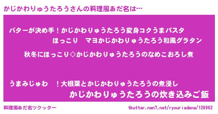 | 男性向けラノベタイトル風あだ名 | 『かじかわりゅうたろうに滅ぼされるだけの簡単なお仕事です』 |