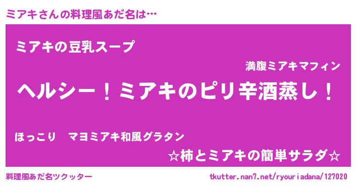 | 男性向けラノベタイトル風あだ名 | 『Re:ミアキから始める異世界生活』 |