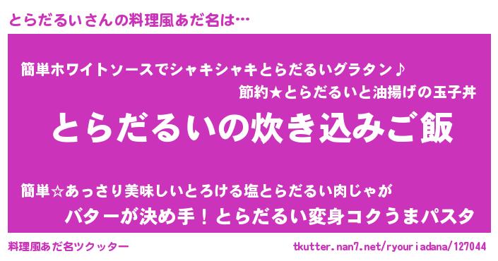 | 胡散臭い通販商品みたいなあだ名 | 『全米が絶賛したサプリメント…その名も「とらだるい」』 |