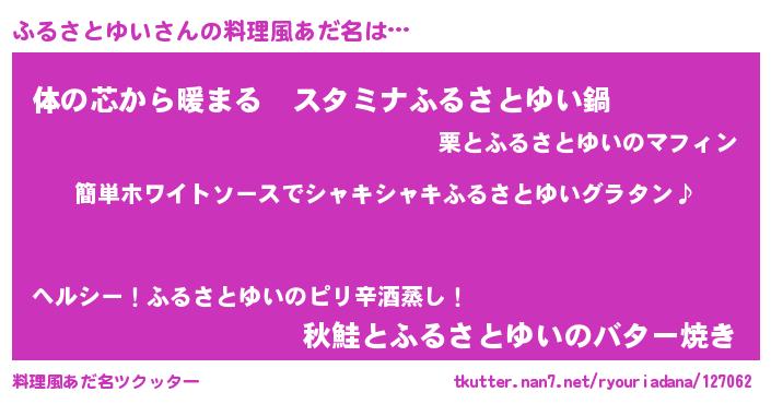 | 男性向けラノベタイトル風あだ名 | 『ふるさとゆいの嫁は女の子じゃないと思った?』 |