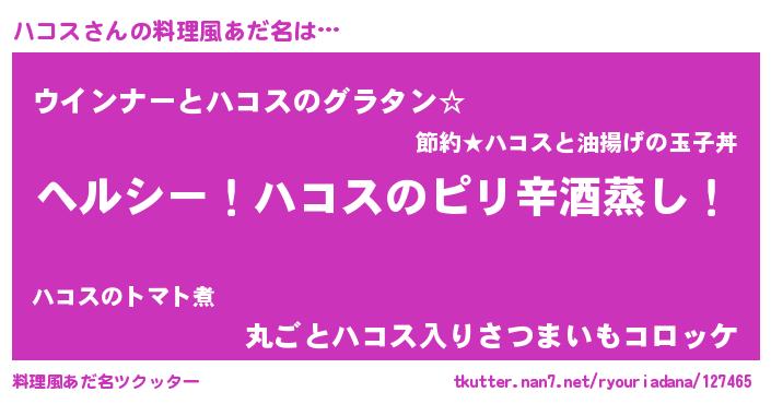 | 男性向けラノベタイトル風あだ名 | 『Re:ハコスから始める異世界生活』 |