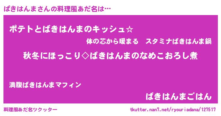 | 男性向けラノベタイトル風あだ名 | 『ばきはんまに滅ぼされるだけの簡単なお仕事です』 |
