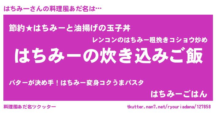 | 男性向けラノベタイトル風あだ名 | 『うちのはちみーが世界を掌握している!』 |