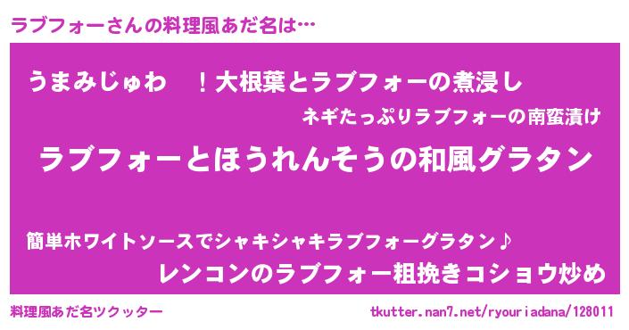 | 男性向けラノベタイトル風あだ名 | 『転生したらラブフォーだった件』 |