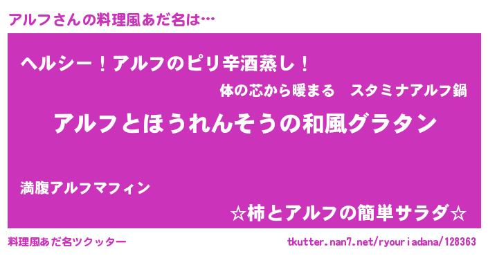 | 男性向けラノベタイトル風あだ名 | 『アルフ~年齢イコール彼女いない歴の魔法使い~』 |