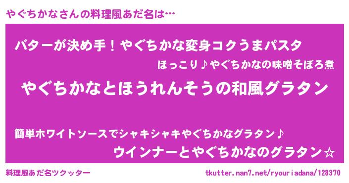 | 女子向けラノベタイトル風あだ名 | 『やぐちかなの玉の輿計画!』 |
