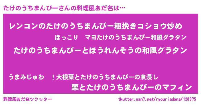 | 男性向けラノベタイトル風あだ名 | 『たけのうちまんぴー~年齢イコール彼女いない歴の魔法使い~』 |
