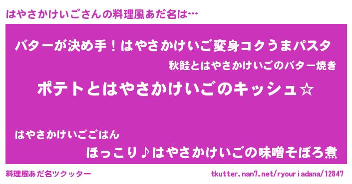| 女子向けラノベタイトル風あだ名 | 『はやさかけいごの卵を拾いまして』 |