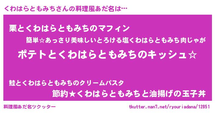 | 男性向けラノベタイトル風あだ名 | 『くわはらともみちの嫁は女の子じゃないと思った?』 |